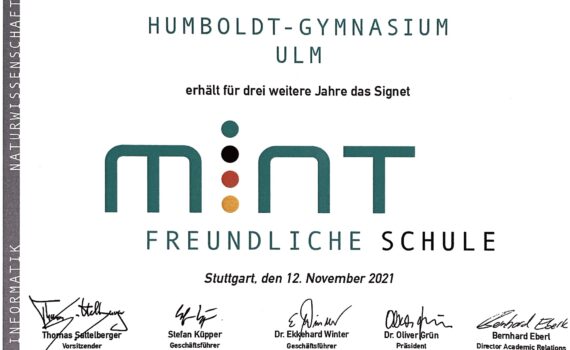 Unsere Schule hat für weitere drei Jahre die Berechtigung, den Titel „MINT-freundliche Schule“ zu tragen. Bei den Verantwortlichen Kolleginnen und Kollegen möchten wir uns dafür bedanken und ihnen auch zu diesem Erfolg gratulieren. Mehr Informationen zur MINT-freundlichen Schule gibt es hier.