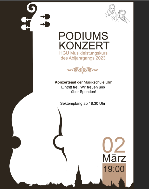 Allgemein Einladung zu unserem Podiumskonzert 2023 von Redaktion Schule|Veröffentlicht am 16. Februar 2023 Unser Musikkurs auf dem Weg zum Abitur lädt herzlich zum Podiumskonzert ein!
