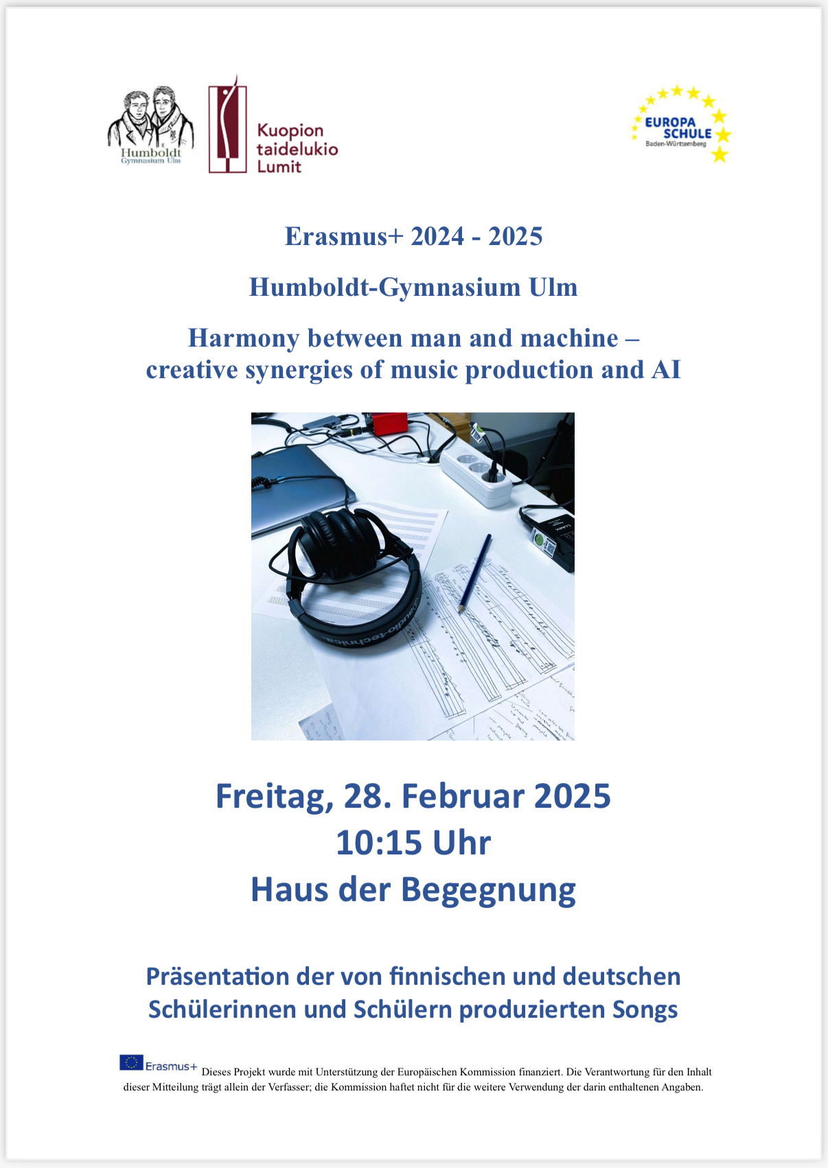 Die Abschlussveranstaltung unseres diesjährigen Erasmus+-Projekts „Harmonie zwischen Mensch und Maschine – kreative Synergien Musikproduktion und Künstliche Intelligenz“, bei der die ProjektteilnehmerInnen ihre 12 in binationalen finnisch-deutschen Teams mit und ohne KI erstellten Popsongs vor einer Jury sowie ca. 400 Gästen im Haus der Begegnung vorstellten, war ein gelungener Abschluss des Projekts.