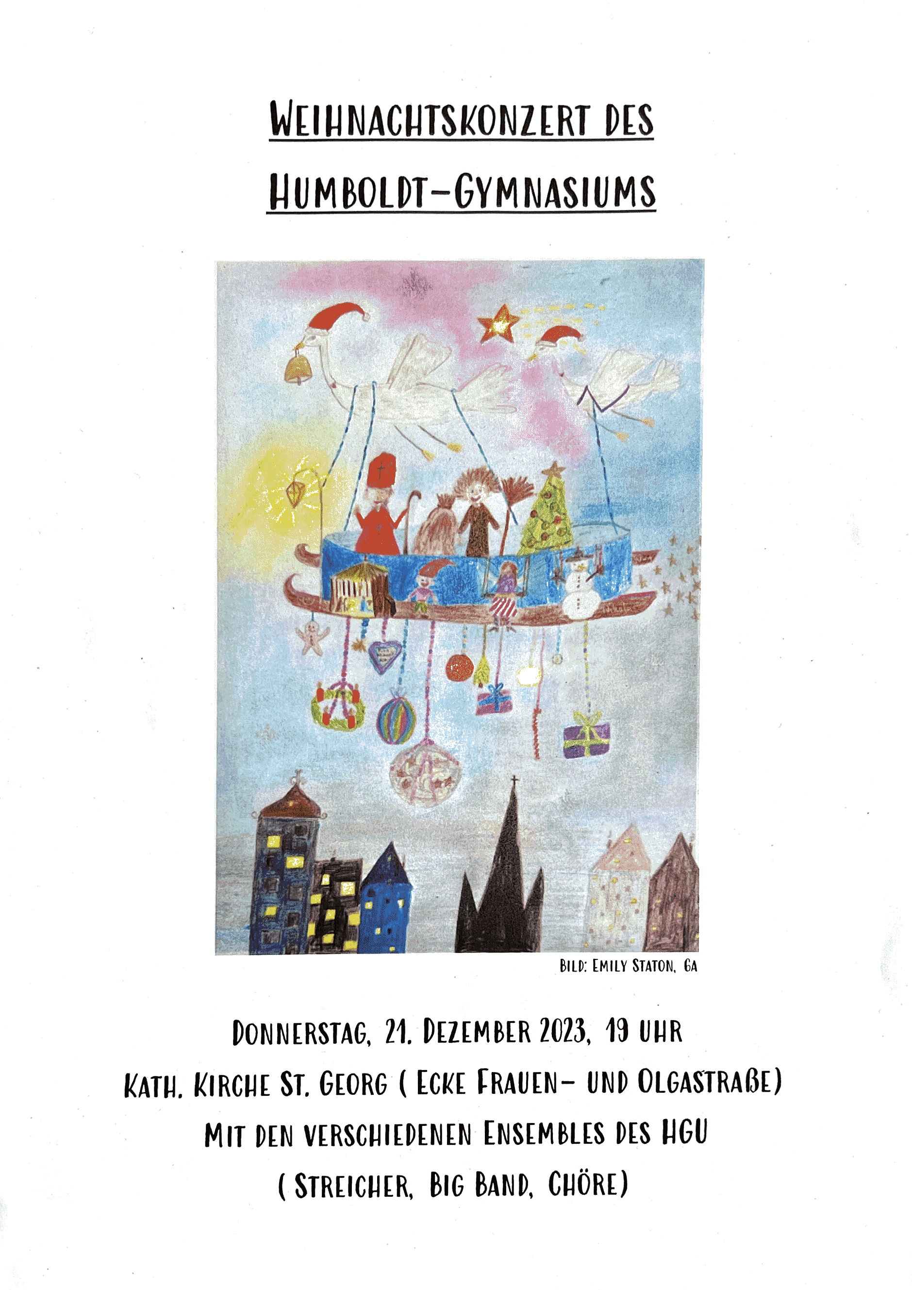 am 21.12.23 findet in der katholischen Kirche St. Georg um 19 Uhr das traditionelle Weihnachtskonzert des Humboldt-Gymnasiums statt.