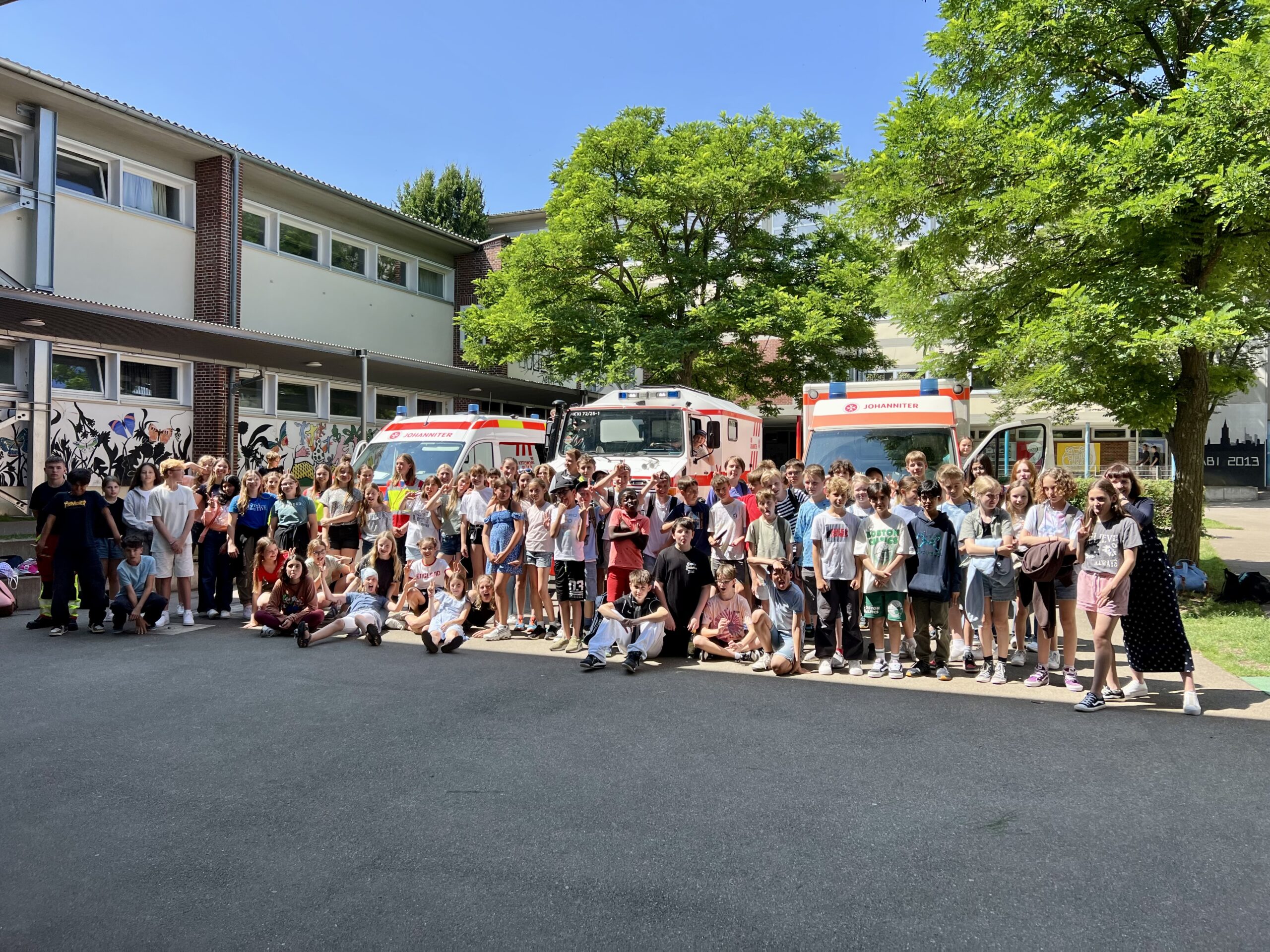 Am Montag, 15.07.24 fand der seit diesem Schuljahr verpflichtende Katastrophenschutztag für unsere drei Klassen 6 statt. Vier Ehrenamtliche von der Johanniter Unfallhilfe sowie unsere hauseigenen Schulsanis unterstützten uns hierbei und ermöglichten es uns einen Vormittag lang, sowohl theoretisch im Klassenzimmer als auch praktisch draußen auf dem Schulgelände allerlei Wissenswertes und Interessantes rund um das Thema Katastrophenhilfe zu erfahren.
