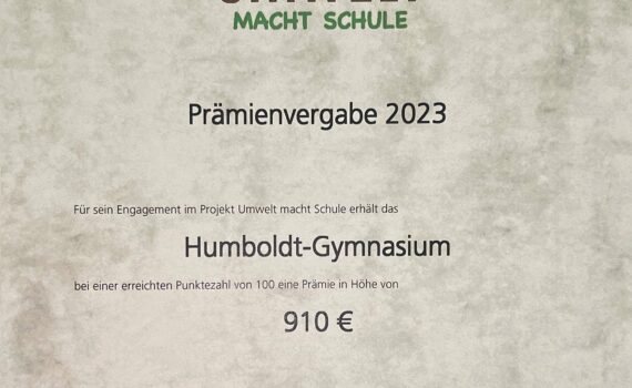 Wir freuen uns, auch in diesem Schuljahr eine Prämie für unsere Bemühungen um die Umwelt erhalten zu haben!