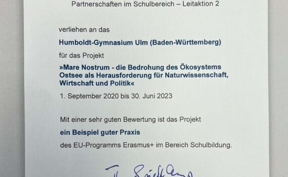 Vom 16. bis zum 22. April fand am Humboldt-Gymnasium in Ulm die Abschlusswoche des englischsprachigen Erasmus+-Projekts „Mare Nostrum – Die Bedrohung des Ökosystems Ostsee als Herausforderung für Naturwissenschaft, Wirtschaft und Politik“ mit unseren finnischen, polnischen und schwedischen Erasmuspartnerschulen statt. Nachdem die Projektschülerinnen und -schüler im Oktober 2022 in Polen Kartenspiele […]