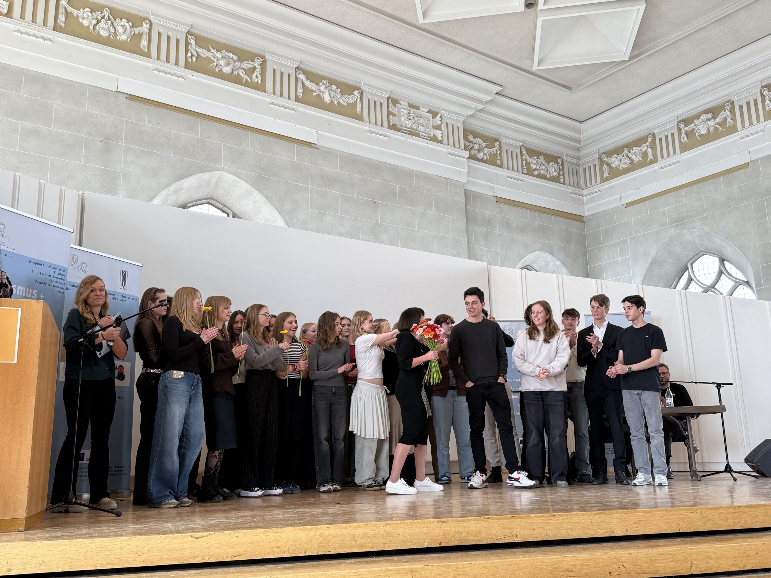 Als Abschluss wurden die in deutsch-finnischen Schülerteams produzierten Popsongs und drei Kurzfilme zu Grenzen und Chancen beim Umgang mit KI-Apps, die Projektschüler des Filmteams zusammen mit den Medienbildungslehrkräften erstellt hatten, in einer großen Präsentation im Haus der Begegnung der Schulgemeinschaft vorgestellt und von einer Fachjury besprochen. Alle Schülerinnen und Schüler, Eltern und Lehrkräfte konnten dabei über eine Handy App ihre Lieblingssongs listen. The winner team was Samuel (Kuopio) /Constantin (Ulm) with „Guiding light“.