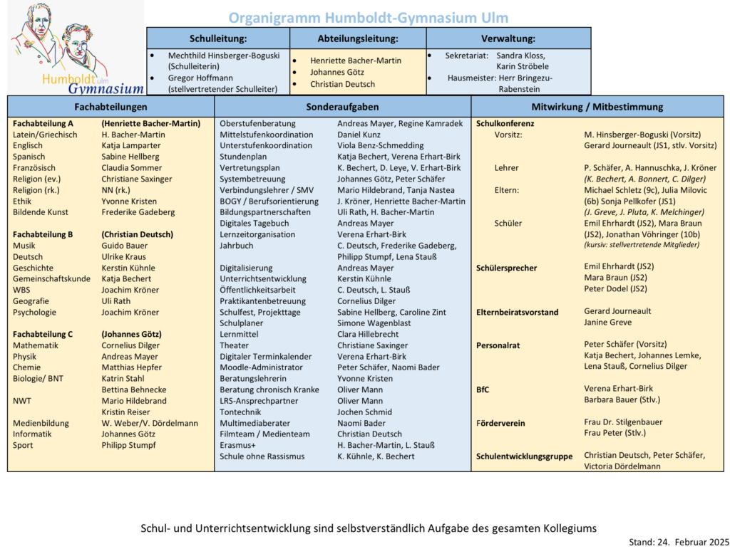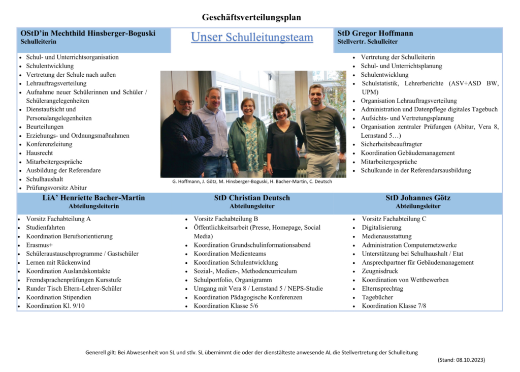 Unser Schulleitungsteam besteht aus unserer Schulleiterin Mechthild Hinsberger-Boguski aus dem stellvertretenden Schulleiter Gregor Hoffmann und unserer Abteilungsleitern Henriette Bacher-Martin, Johannes Götz und Christian Deutsch