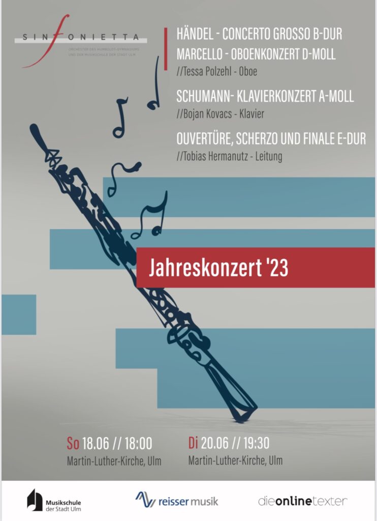 Allgemein Sinfonietta Jahreskonzerte von Lena Stauß|Veröffentlicht am 24. Mai 2023 Bald ist es soweit, die Jahreskonzerte unserer Sinfonietta stehen an! Herzliche Einladung!